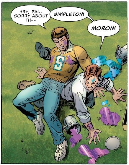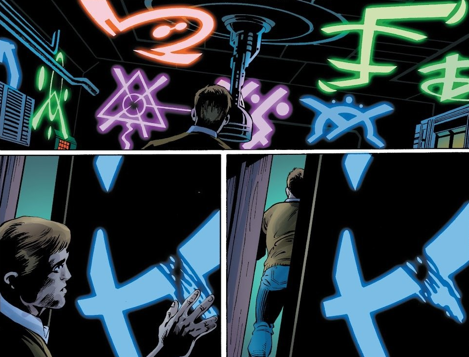 We begin in the past, at college, for the first meeting between young Ben and young Victor Von Doom. Ben accidentally spills some paint on Doom, and then they’re enemies. Ben catches up with young Reed, so they’re already friends at this point. Later, Ben and two other friends sneak into Doom’s lab and mess with everything. As they’re leaving, Ben discovers the paint is ultraviolet glow-in-the-dark paint, and Doom has scrawled magical sigils and whatnot all over the walls. Ben scraps off part of one as he leaves.