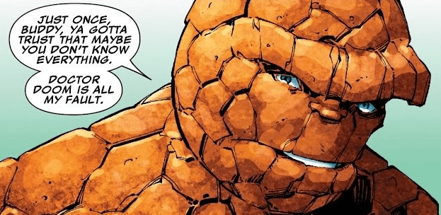 Recap: The FF are in the midst of a year-long expedition through time and space, as a front for Reed searching for a cure to a molecular illness that’s killing him. Along the way, we learned that Ben is affected as well. Then Ben recently revealed that the accident that scarred Dr. Doom back in the day was actually all his fault!