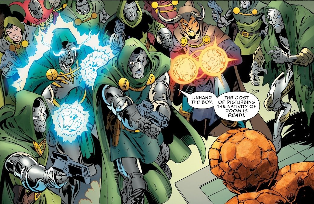 Young Doom is genius enough that he can tell the Thing is Ben. Then all the Dr. Dooms take off their bracelets (or whatever) and revealing themselves to attack Ben. Then Reed undoes his invisibility to get young Doom out of the room while Ben fights all the Dr. Dooms. Reed confronts young Doom, asking what he was thinking. Young Doom says, “In the end, I wanted greatness.”