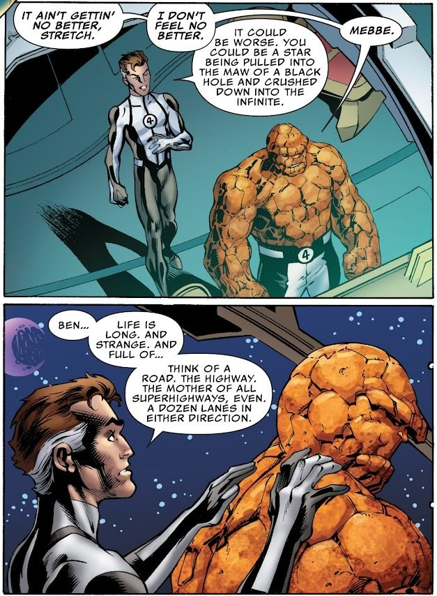 Later, Ben and Reed have a heart-to-heart chat. Ben still feels like Dr. Doom’s accident was all his fault. Reed says the timeline is like a superhighway, full of traffic lanes in all directions. If you tap your breaks for a second, can you be responsible for accidents dozens of lanes over? There’s a flashback to the John Byrne retelling of Doom’s origin, where he got a tiny scar on his cheek, and then he had those creepy monks permanently burn the hot metal mask onto his face. Ben wonders if being the Thing is punishment for what he did to Doom. Reed says, “It didn’t matter. It would have happened anyway. No matter what.”