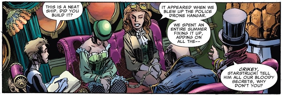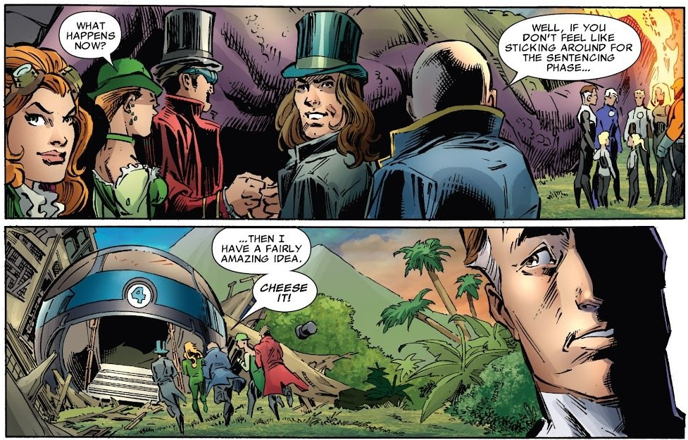 Recap: Reed has taken the family on a year-long expedition through time and space, which is a front for him seeking a cure for a molecular disease of some sort that’s slowly killing him and his teammates. As the disease started to affect his teammates, Reed came clean with them. On the utopian planet Celeritas, the heroes were flung forward in time and separated by steampunk-ish time travelers the Preservation Front. Also, the future version of Johnny, known as Old John Storm, has shown up in this timeline as well.