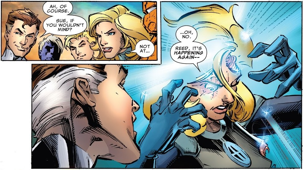 Fade out: Sue turns partially invisible when her powers freak out. The comic only suggests this also affects her force fields, but doesn’t outright say it.