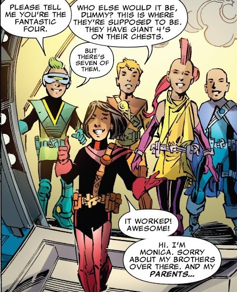 Trivia time: This is the final appearance of the Preservation Front. I guess the world just wasn’t yet ready for steampunk time-traveling thieves. The grandkids have no entries in the Marvel Wiki. Only one of them gets a name, Monica.