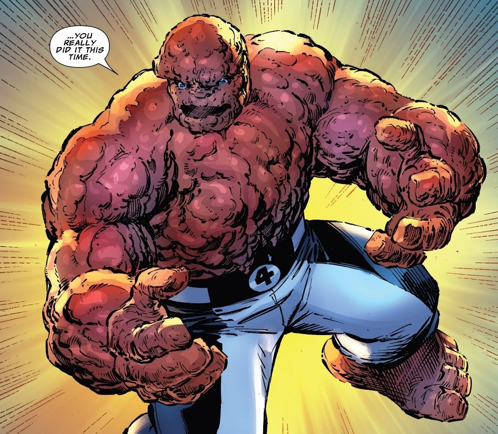 Clobberin’ time: Ben wears white gloves throughout this issue, another result of the molecular disease making him lose his rocky exterior.