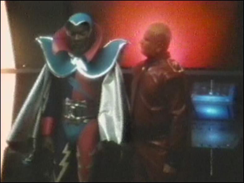 What the felgercarb? Our villain wears bright red tights with lightning bolts on his legs. Did I mention the disco influence?
