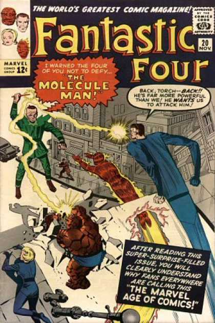 The science lesson is interrupted when a glowing ball of energy shows up outside. The FF fight it, but their powers are mostly useless against it. They’re sucked into the ball, which transports them to another dimension, where they reunite with the Watcher. He gives his usual speech about how he wouldn’t be interfering except that the need is so great. He shows the FF an image of a laboratory tech how has the power to destroy worlds, galaxies, even the entire universe. There’s a lab accident, and this lowly guy ends up with lightning-shaped scars on his face. His boss tries to fire him, but, with a wave of his hand, the man covers his boss with ice. Knowing he can mentally control the shapes of molecules themselves, the guy renames himself the Molecule Man.