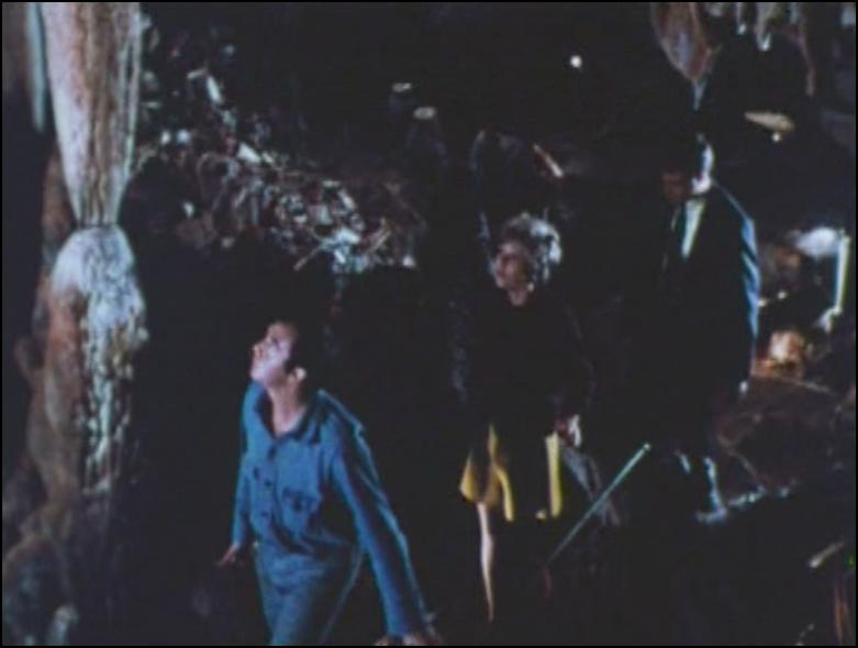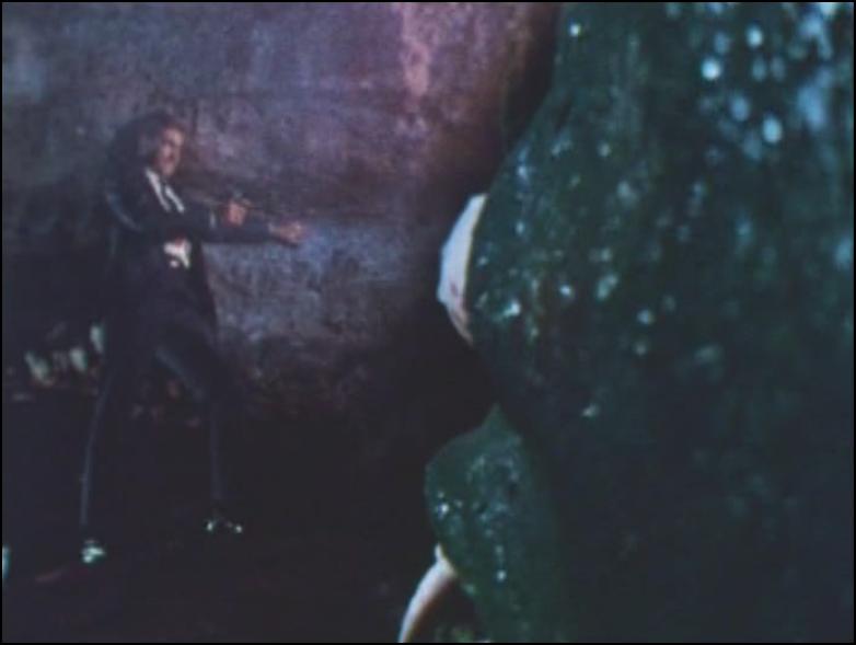 Speculative spectacle: Said nasty surprise is a giant aquatic dinosaur, lurking in an underground lake. After a long, tense build-up to the reveal, it turns out to be a clunky rubber-suit monster of the schlockiest kind.