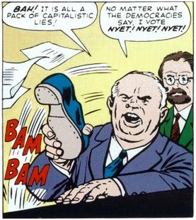 Next thing we know, Reed is addressing the U.N., telling them how dangerous Namor is. (There’s a funny bit where the Russian delegate smashes his shoe on the table, shouting “Nyet! Nyet! Nyet!”) The next person to take the stage is a Dr. Falton, who gives us a complete history of Atlantis. Homo Mermanus, he explains, went through a similar evolutionary process as Homo Sapiens, except with the ability to breathe underwater. The evolved, developed civilization, and so on. On one fateful day, a human, Captain McKenzie, encountered an Atlantean, Princess Fen. Romance blossomed, and along came Namor, described as “the first known mutant of our time.” Reed interrupts, saying that Namor must be stopped, and humanity must fight back. That’s when Dr. Falton reveals he’s actually Namor in disguise (shocker)!