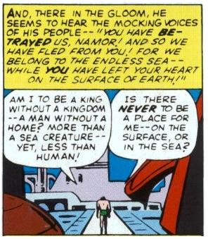 In the final scene, Namor returns to Atlantis, finding it deserted. Feeling betrayed, Krang and Dorma have taken over and led the Atlanteans off to a new home, far from Namor. “Am I to be a king without a kingdom – a man without a home?” Namor asks. “A sea creature – yet less than human? Is there never to be a place for me – on the surface or the sea?”