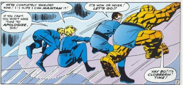As one of the Mole Man’s subjects approaches with a detonator, Sue acts quickly, surrounding it with an invisible force field. She uses another force field to escape from the netting. Check it out: This isn’t just a historic issue for Sue, but it’s one for the Thing to — the very first time he ever says “It’s clobberin’ time!” (He also adds, “Yay bo!” which didn’t catch on as much.)