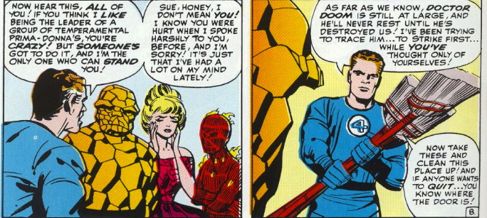 Everyone say it with me: This issue’s story begins with a mishap in Reed’s lab. A baby dinosaur is on the loose! Turns out Reed stepped out for a while, leaving Johnny and Ben in charge. They turned their backs on Dr. Doom’s time machine for a second, and the dinosaur came bumbling out. After catching it and returning it to its own time, Reed takes a second to exposit that they’ve relocated the time machine to the Baxter Building after that Rama-Tut business in issue #19. He then reads Ben and Johnny the riot act, calling them “childish” and “my so-called partners.” He then lays it real thick, saying, “In case it’s slipped your alleged minds, the work we do here means something,” and, “Stop flapping your lips and get back to work!” This encounter has Ben, Johnny and Sue saying it’s time the team had a new leader.