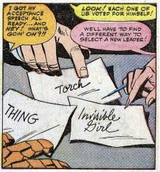 At the Baxter Building, Sue, Ben and Johnny hold an impromptu election for a new leader. They of course each vote for themselves, solving nothing. Ben and Johnny start fighting, and we get a tiresome three pages of them duking out, all while trashing everything in the room. Reed steps in and breaks up the fight. Still Mr. Attitude, he says, “If you think I like being the leader of this group of temperamental prima donnas, you’re crazy! But someone’s got to do it, and I’m the only one who can stand you!”