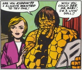 At the Baxter Building, a mysterious box has arrived for the Thing from the Yancy Street Gang, and there’s a lot of anticipation about what mischief might be inside of it. Our heroes open the box, and… it’s a Beatle wig. Johnny thinks this is hilarious, and he and Ben tussle for a few panels before being broken up by Reed, in this usual “the characters need an excuse to show off their powers for a few pages at the start of the issue” thing. Once everyone’s settled down, Ben tries on the wig, and declares, “I’m a livin’ doll!”