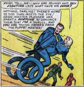 Meanwhile, Sue stops her suburban house… wait, where did this house come from? She doesn’t live at the Baxter Building with her teammates? Inside, she finds a message telling her that Johnny has been replaced by one of Dr. Doom’s lookalike robots. Johnny conveniently shows up, and Sue confronts him. Johnny stupidly assumes that Sue is being controlled by the Puppet Master, and they fight.