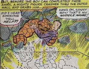 Remember those workmen? They’re on Gideon’s payroll, and they’re busy setting up a variation of Dr. Doom’s time machine inside the Baxter Building, as a trap for our heroes. Unfortunately, that’s when little Thomas blunders into the building. (So anyone can just go walking into the Baxter Building now? Is there no security? No locks? No alarms? No “Do not enter” sign?) He gets caught in the time machine. Ben tries to save the kid, and both of them vanish, lost in time.