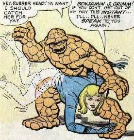 This one begins on an odd note, in which our heroes are standing atop a bunch of giant photographs Reed took during their trip to the Skrull homeworld last issue. This is quickly forgotten about in favor of some wacky slapstick in the customary “the characters show off their powers for a few pages at the beginning” thing, including a weird bit where Ben catches Sue and threatens to spank her! He’s just kidding, right?