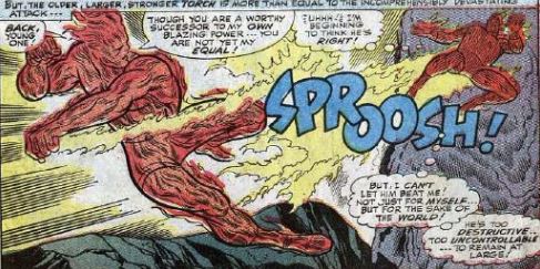 Flame on: Johnny proves he can throw punches as well as fireballs, as the fight against the original Torch goes into hand-to-hand combat. He’s also able to appeal to the original’s better nature.