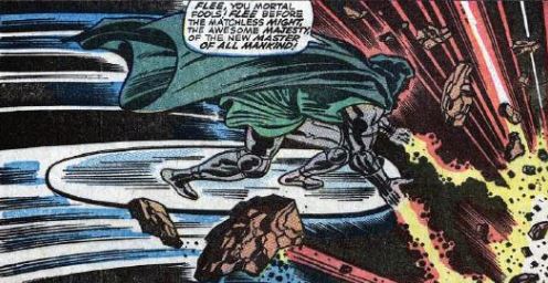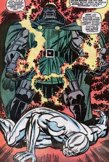 Doom then makes his move, sneaking up behind the Surfer with a pair of high-tech inductors. In two pages of amazing Kirby action (complete with Kirby dots!) Doom draws the cosmic energy out of the Surfer and into himself. “Now let mankind beware,” Doom says, “for Doctor Doom has attained powers without limit!”