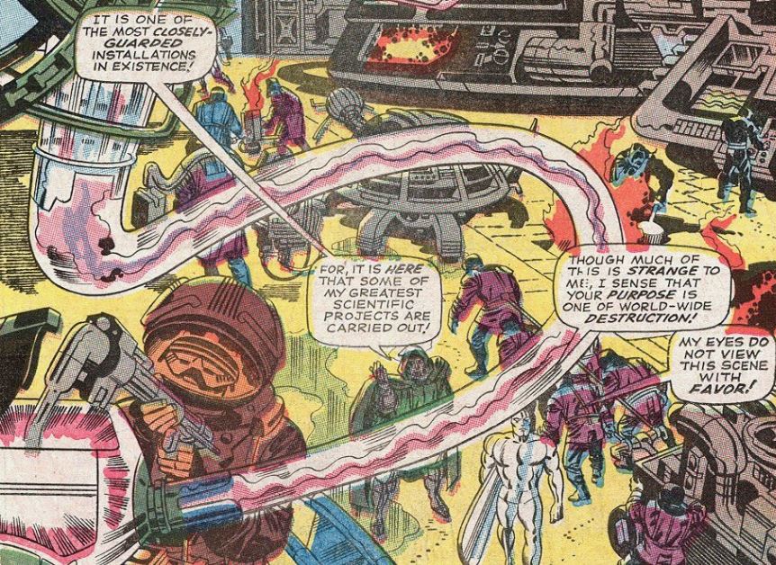 We’ve seen Reed’s lab lots of times, so next it’s a look at Dr. Doom’s science lab. In true Jack Kirby style, it’s full of outrageous scientific wonders. The Surfer believes Doom is creating world-destroying weapons, and he doesn’t approve. Doom gives him the big speech about how his weapons actually preserve peace and freedom, is all. “I am the gentlest, most unambitious of monarchs!” he says. The Surfer still isn’t buying it, especially after seeing Doom snap at his servants. But Doom has the Surfer figured out as well. He shows the Surfer an “actual temporal photo” of outer space, and the Surfer is mesmerized by it, because he still longs to be out in space instead of exiled to Earth. There’s one panel where the Surfer has this huge grin on his face, uncharacteristic for him.