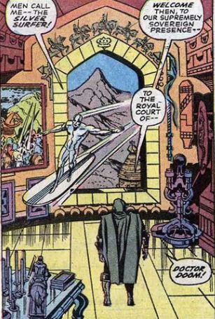Cut to Latveria, where the Silver Surfer is brooding on a mountaintop (he does that a lot). A tiny rocket invites him to visit the nearby castle. Now who do we know who lives in a castle in Latveria and has access to futuristic tech? Yes, it’s Dr. Doom. (He’s ballsy enough to sign his letter, “Doom Rex.”) The Surfer flies to Doom’s place and they chat. Doom says he seeks knowledge and wants to learn about the Surfer’s flying surfboard. The Surfer buys it, and explains that board is made of pure cosmic energy, the same cosmic energy that gives the Surfer his power. Doom asks for a demonstration, asking the Surfer to create a weapon. He does, some sort of club. Doom tests it out and finds it incredibly powerful, able to destroy an entire wall (that’s your castle, Doom) but the Surfer is smart enough to dematerialize the weapon before Doom gets too in love with it. Doom then leads the Surfer farther into the castle, saying, “We have matters of great magnitude to be discussed!”