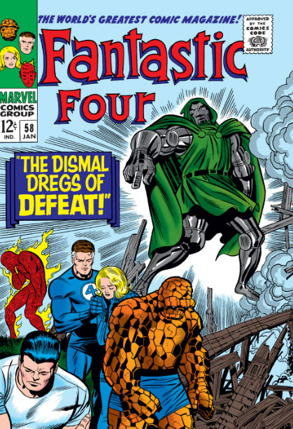 Re-reading the Fantastic Four comics from the start. Issue #58 is titled “The Dismal Dregs of Defeat.” How come no one uses the word “dregs” anymore? Anyway, our heroes are in big trouble this time around, as they confront Dr. Doom, who has just stolen the Silver Surfer’s cosmic powers.