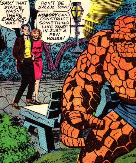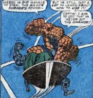 On cue, Doom shows up, flying around outside on the Surfer’s silver surfboard. He blasts Ben out of the building, and into a nearby electric billboard. Although outmatched, Ben fights back, separating Doom from the board and pummeling him. Doom isn’t helpless without the board, though. He zaps Ben with “vibration rays,” rendering Ben completely motionless, like a statue. Doom leaves Ben in Central Park, where passersby think he’s an abstract work of art.
