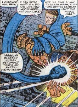 Meanwhile, Dr. Doom is being a total dick! Flying around on the Silver Surfer’s board, he uses his powers to make a city live in perpetual night, he covers a tropical seaside town in snow, and he transforms a perfectly innocent gorilla into a giant monster for absolutely no reason. Back in Reed’s lab, Reed has invented a tiny mechanical bat. He tries it out on Ben, knocking Ben off his feet and angering him. Another fight breaks out, but Reed stops it this time, saying his device worked as predicted. It can knock Doom out for a few seconds, which is sure to outrage him, and this might give the FF a momentary advantage.