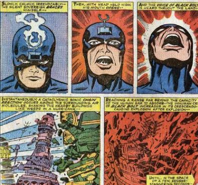 On cue, we go from there to the Inhumans’ city, still trapped under that big dome. Black Bolt flies over the rooftops, and we get a rare glimpse of Inhuman commoners marveling at him. With a gesture, the silent Black Bolt commands his people to seek shelter. Once the city’s population has left the streets, Maximus appears and urges Black Bolt not to do what he’s about to do. In a show of brotherly compassion, Black Bolt protects his evil brother. Then — are you ready for this? — Black Bolt speaks. Now we know why he never talks, because one syllable of his voice is enough to level buildings. After two pages of sweet Jack Kirby destruction, Black Bolt succeeds, and the dome over the city is destroyed. The Inhumans have their freedom.