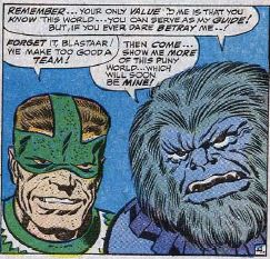 Blastaar calms down just long enough to explain his deal: He’s a power hungry conqueror, and now that he’s discovered Earth, of course he wants to rule it. He describes Sandman as his guide to this new world, but Sandman keeps calling Blastaar his partner. The two of them descend from the roof into the Baxter Building.
