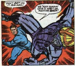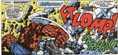 Out in the city, Johnny and Crystal are leaving a restaurant (they got pretty far in those two seconds), where they see a bunch of cops on the move. Blastaar and Sandman are now casually walking down the street, duking it out with the cops (How they got from the Baxter Building to here I have no idea). The police have a special “cement gun” that traps Sandman, only to have Blastaar set him free. Johnny flames on and joins the fight. In a full-page spread, Blastaar brags about how powerful he is (he’s rather boastful, this Blastaar). While the bad guys concentrate their attacks on Johnny, they’re attacked from behind by the Thing. Sandman escapes into the sewer, but Blastaar fights on, spending the next couple of pages duking it out with Ben.