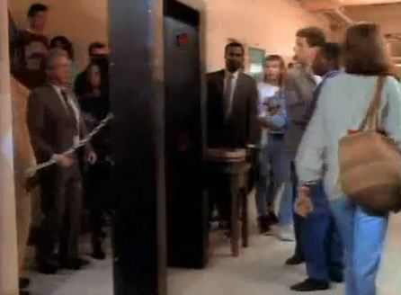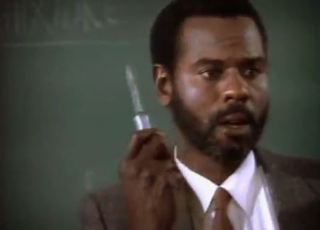 Torn from today’s headlines: This one’s somewhat prescient, sadly, with its theme of weapons in school, as there’s a lot of paranoia about students roaming the hallways with guns. A later scene has the school installing a (phony-looking) metal detector. Then things get tear-jerky when it’s revealed that one of the tough kids never learned how to read.