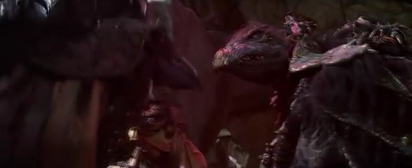 The slaves pull a bunch of ropes, triggering an unseen mechanism that brings a giant black stone up out of the ground. The stone has two huge swords affixed to it. We get our “action movie” shot in which the Chamberlain and the General raise their swords, yell with anger, and clash them together. That final part is captured in a close-up of the swords clanging into each other. Chamberlain and the General circle the stone while still hissing and growling at each other, but this is no high-flying swordfight. The General swings his sword and strikes the stone with a mighty blow, to which all the other Skeksis cheer for him. So this trial is a test of strength, whoever can ding the stone the hardest wins. During this, the Blu-ray’s subtitles have one of the Skeksis in the background saying “I’m taking it.” Does this mean they’re gambling on the outcome?