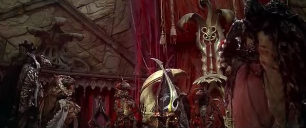 The scene takes place in the Skeksis’ throne room. There’s no establishing shot of the castle beforehand, as the audience is now familiar enough with the Skeksis to know that’s where they are. Even in this first shot there are some interesting details to notice. Both the Garthim and some Podling slaves are milling about in the background, before being properly introduced. Also, there are stairs off to one side. I could be wrong, but I believe this is the only time we see stairs in the movie, as most of the architecture prefers big ramps to stairways. This is of course easier to accommodate puppeteers and cameramen moving around the sets, but it also gives the structures an organic feel, especially after reading passages in the tie-in books that describe the characters’ homes as “grown” or “shaped” rather than built.