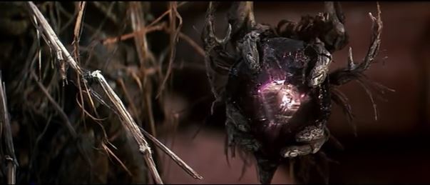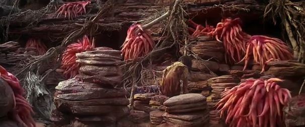 Jen is climbing up the side of a huge rocky cliff face, and based on the background, he’s way up high. (This is a matte painting, of course. I miss matte paintings in fantasy movies.) It fades to another shot, showing the passage of time and Jen’s progress. He is now walking through a bunch of rocks with big pink vines all around. He trips, making a nice, and all the vines spring to life, retreating into caves and holes in the walls. I love watching this scene with people who’ve never seen the movie before. It blows their minds!