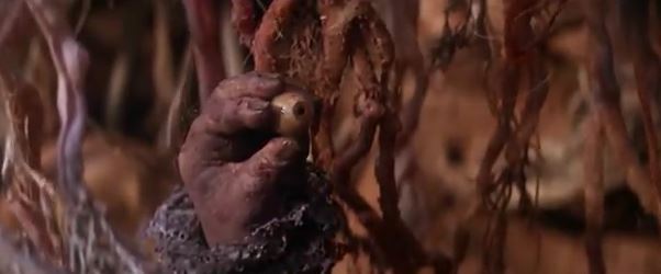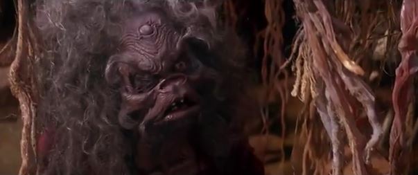 Jen wanders into a bunch of vines (a different kind from the ones before) only to get caught up in them. Then, the vines lift him up off the ground, Ewok trap-style. He looks around for a few seconds, and then looks down and reacts with surprise. We see what he’s reacting to and… are you ready for this? It a grubby hand holding an eyeball, and the eyeball is able to move independently, looking around. It’s a real “how did they come up with this stuff?” moment. This stranger speaks in another language for a few seconds, and then we see who it is. This is, for lack of a better description, and old lady, with a wrinkled, frumpy face, long grey hair, and, uh, ram’s horns. She places the eye into its socket, with the other socket remains grossly empty. On her forehead is a circle, which many have speculated is the mystical “third eye.” Indeed, the info at DarkCrystal.com states she is three-eyed, with two blind eyes.