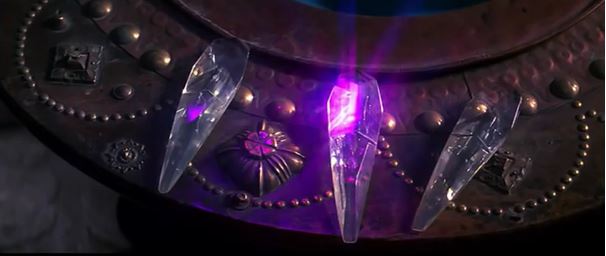 There’s a fade and accompanying music cue to show the passage of time, but the action doesn’t leave Aughra’s orrery. It’s just later now. How much later is left ambiguous. Aughra hangs out in the back of the room, peering around the giant machine. It almost looks as if she’s staring right at the camera. No, she’s watching Jen from a distance. Jen, with his back to her, looks at three of the crystal shards he picked out from the ones Aughra gave him. In voiceover, he says he knows it’s one of these three, but he’s not sure which one. Aughra tells him to hurry, and he frets over how to choose. He has a flashback to the Mystics doing their deep-voiced chant, and he pulls out his flute. He plays a note that sort-of matches the chant, and the middle of the three shards glows with a purple light in response. Jen stops playing, but the shard continues the note, in something of a high-pitched chime. That’s how we know this is the shard Jen’s been searching for.