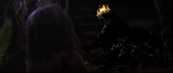 We cut to outside, with Jen sliding down a hill. He tumbles and falls until landing in some tall grass. He looks up at the orrery to see it burning in flames. It also looks really far away. It’s another passage of time question, in that how long was he sliding down the hill? Jen says just “Aughra,” to let us know he’s thinking of her, and then he runs off into the woods. The camera pans over, and there’s the Skeksis Chamberlain, watching him. We know it’s the Chamberlain because he does that whimper again. Why didn’t the Chamberlain just abduct Jen right there? We’re not told, except that we know the Skeksis have a penchant for scheming and plotting, so perhaps he wanted to study Jen more before making his move. How did the Chamberlain get there? Remember where he was the last time we saw him – secretly following the Garthim. They led him here.