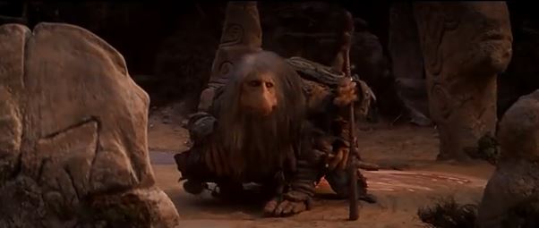 What’s going on here? These are pretty much just Muppet Show-type gags, the little one-joke interstitial skits that used to tie scenes together on that series. Another thing is that in fantasy, it’s not enough to establish fantasy elements at the beginning of the story and leave it at that. You’ve got to keep re-establishing fantasy elements throughout, to keep things interesting and exciting for readers/viewers. This is why so many fantasy stories are travelogues, so that characters can discover new fantasy weirdness in each new place they visit. But this is more than just mood-setting. On the Blu-ray’s commentary, Brian Froud makes a case for this scene being a mission statement of sorts for the whole movie. He repeats over and over two statements on the nature of this world – that everything is alive, and that all things are connected. This and the tie-in books emphasize that, on this world, there are no distinctions between animal, vegetable, and mineral. There are descriptions of stuff like trees that walk, animals that remain motionless like boulders for years on end, and even rivers that contain the world’s memories at their deepest depths. Knowing that everything, absolutely everything, in this world is a living creature adds to our enjoyment of the movie, and the richness of this fantasy world.