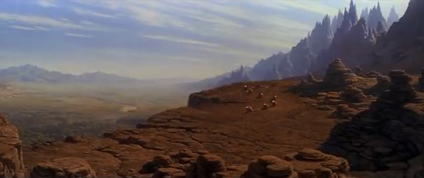 There’s a fade, and the next shot is of the Mystics slowly marching down a huge mountainside. This raises a huge question: How much time is passing? The passage of time is suspect throughout the entire movie, but it stands out the most in these shots of the Mystics on their travels. They move really slowly, and, as we’ll see throughout the film, they appear to cover a lot of distance. Jen, meanwhile, doesn’t seem to travel as far or for as long. Is it possible that the Mysics are using magic, to cover a long distance in a short amount of time. The movie doesn’t tell us this, but it’s a possibility, considering how little we know about how magic works on this world. (Yes, I’m also aware that it’s a film editing thing, and that editors employ tricks like this all the time to create the illusion of the passage of time from scene to scene. Shut up and let me have my fun.)