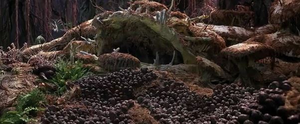 These next bits are hard to describe, but I’ll do my best. We cut to a forest/swamp setting. A few flowers on a log spin their petals like helicopter blades and take off flying (the screenplay calls these “flying mushrooms”). A small creature pokes his head out of a pond, and the thin tree next to him actually walks out of the water and onto land. A mushroom, one that looks like an actual mushroom this time, bends down and ducks under the water. A creature the screenplay identifies as a “weasel,” but which appears to have a turtle-like shell runs across the screen, chasing a small bug, trying to catch it in its mouth. Only, it gets swallowed by a big grassy mound, like a big Venus fly trap. An insect, called a “stick creature” in the screenplay, climbs up the side of some vegetation. The top of a cactus-like plant has what looks like a little tuft of hair, which moves in and out suggesting that the plant is taking breaths. In the background, a bunch of similar plants simultaneously sprout hairlike growths.