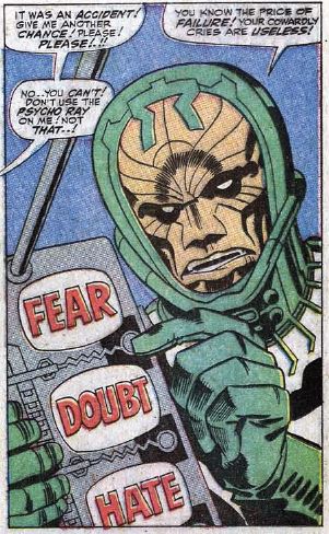 The story begins as Sue mysteriously faints. Or, as Ben puts it, “She just went kerplunk!” She wakes, and insists she’s fine. Ben then takes off his jetcycle to go visit Alicia. We go from there to a “carefully-locked, completely soundproofed building,” where the evil Psycho-Man is displeased with one of his henchmen. The goon delivered a component to the wrong address, and now must be punished. Psycho-Man announces that he is the master of all emotions. He sets his Pyscho-Ray to “fear,” and causes the guy to have terrifying hallucinations. We then meet Psycho-Man’s other three henchmen, Live Wire, Ivan, and Shell Shock. Live Wire, who is dressed as a cowboy, tries to rebel with his electric pistol and electric lariat, but Psycho-Man’s armor to too strong for him. He sets the Pyscho-Ray to “doubt,” thus ruining their self-confidence and making them loyal to him.