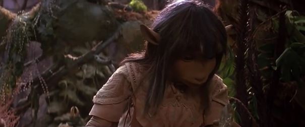 Jen falls back into some mud while Fizzgig – a little dog-like creature – continues to growl at him. Jen dismisses Fizzgig as a potential danger, instead grousing, “Oh, no, right in the mud.” (More about Fizzgig in the next post, I promise.) Then, the hooded figure steps out of hiding. We see just enough of the stranger’s face to tell that this is something familiar…