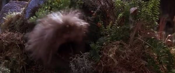 Here’s where we get the big jump scare. Does it work? That depends. As soon as we see the log, and the camera ever so slowly pushing in on it, we know there’s going to be a jump scare, but a lot of us jump anyway. In Roger Corman’s memoir, he writes at great length about the long, dark hallway in movies. He says audiences know something is bad at the end of the hallway, but they’re still burning with curiosity as to what it is. Therefore, a jump scare is not just surprise, but surprise and relief. That’s the case here, as Fizzgig jumps out and scares the audience. Jen, too.