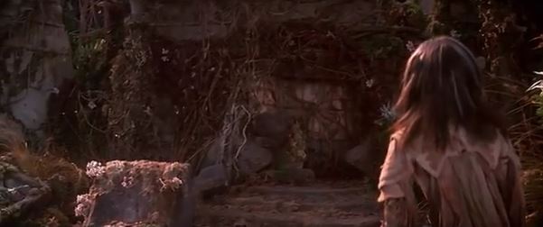 They walk farther into the ruins and we get a better look at them. Hey, remember back when I insisted that fans don’t call the Skeksis’ castle a citadel? That’s because this place, according to the tie-in fiction, is named the Citadel. Also, it was clearly constructed out of carved rock. A lot of the architecture we’ve seen in the film was shaped out of living rock, with curved, natural angles. The Citadel, though, wasn’t shaped through magic or energy, but built with good ol’ engineering, including stonework and bricklaying. It’s ambiguous as to what level of technology the Gelflings achieved. The Legends of the Dark Crystal manga shows them living in tents and caves, but the Creation Myths graphic novels give us brief-yet-tantalizing glimpses of Gelfing boats and huge cities on the seacoast, but beyond that, we don’t really know how far their civilization really advanced. Of course, it’s perfectly plausible that different Gelfling clans achieved varying levels of sophistication, but we’re left only to speculate.