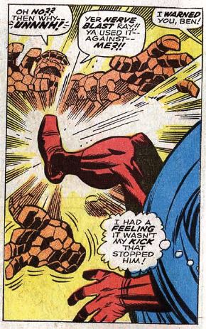 Daredevil arrives at the Baxter Building, hoping to open a dialogue, but Reed and Ben aren’t here to talk. They both attack on the spot. There’s a line of dialogue about Ben being struck by Reed’s “nerve ray,” even though we don’t see this happen. This weakens Ben’s awesome strength, allowing him to be knocked off his feet by a kick from Daredevil. After more fighting, Daredevil kicks Ben into Reed’s “Demolo-gun,” the one from the beginning, and destroys it.