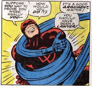 In the lab, Reed continues to attack Daredevil, while Daredevil argues about how to prove himself to Reed. “You should have been a lawyer!” Reed says, amusingly. Reed tries to punch Daredevil, but something invisible stops his hand. It’s Sue, who says she just saw Dr. Doom on the 6 p.m. news, addressing his ministers in Latveria. (Somehow, no one questions whether TV Doom was a robot. Also, I thought Reed said Sue was out of town.) Reed and Daredevil shake hands, and apparently Johnny and Spider-Man are friends again, because they just appear back in the lab. Thor, however, has gone and run off, already back to his pursuit of the Wrecker. Ben suggests going after the real Doom, but Reed says they can’t attack Latveria, because it’s a sovereign nation. With that, the story just ends.