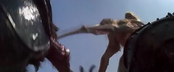 Kira’s Landstrider attacks the Garthim, and sparks and smoke fly from the Garthim’s shell as the Landstrider’s hoof hits it. Remember that the Garthim are articial creatures fueled by the Dark Crystal’s energy, and we’re seeing some of that energy here. One of the Garthim carries the Podlings from Kira’s village in a big net on its back. The net falls from it and rolls to a spot near the cliff edge surrounding the castle. That’s when Jen joins the action, riding toward the fight. Kira falls from her Landstrider, taking Fizzgig with her, while the Landstrider keeps fighting. It’s surrounded by Garthim, but manages to knock one on its back, giving us a look at the Garthim’s underside. (Oh, like you weren’t curious.) Jen jumps off his Landstrider and helps Kira get the Podlings loose. In an impressive bit of puppetry, one of the Garthim lifts a Landstrider off the ground, and then they both go tumbling over the cliff, with the Landstrider making this awful scream as it falls. The rest of the Garthim surround the remaining Landstrider and pull it to the ground. We don’t see what happens next, but it’s safe to say they killed it. Jen and Kira get the Podlings out of their net, but now the Garthim are marching toward the two of them, backing them up against the cliff.