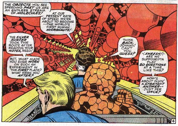 The set-up is this: Galactus has returned to Earth, demanding that the FF deliver him the Silver Surfer, who has retreated into the microverse. Reed makes a deal with Galactus, saying he’ll go get the Surfer in exchange for Galactus not devouring the Earth. Reed, Ben, and Johnny cram into Reed’s newest invention, a submarine-like “Reducta-craft.” Then it’s a throwback to Fantastic Voyage, where they shrink down to microscopic size and prepare to be shot through a needle. Ben complains with his usual grousing during all this, but Johnny compares it to a roller coaster.
