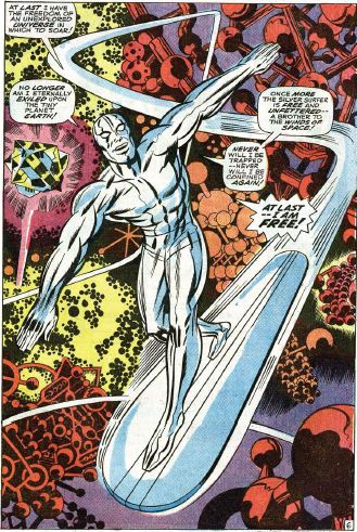 The Surfer lands on a nearby planetoid and surrounds himself with a “cosmic protection shield.” Then it’s a couple of pages of our heroes trying to break through the shield, which they can’t. The Surfer borrows a move from Captain America by throwing his surfboard at the FF which, confusingly, knocks all three heroes for a loop. The Surfer flies off, and is pursued by a mysterious green spaceship.