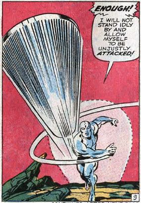 We then get a killer splash page of the Silver Surfer soaring through the microverse. He’s never looked happier, before or since. The normally deep and contemplative Surfer is now exhilarated and joyous, saying “At last I am free!” Then Reed is a total jerk, firing a stun blast at the Surfer, knocking him off his surfboard. He recovers quickly, bragging about being able to survive meteor storms, but Reed says the blast was only to establish contact.